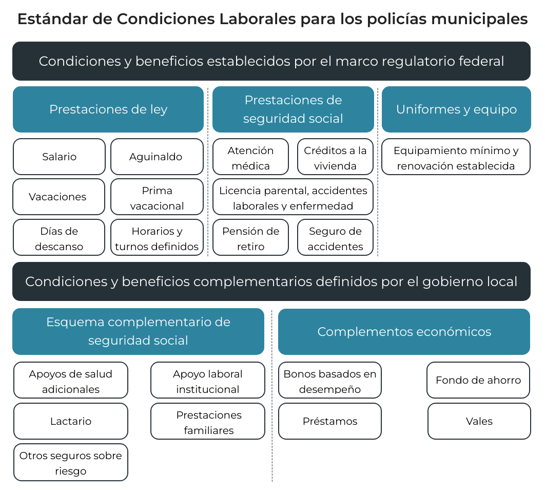 Para establecer un punto de referencia sobre las condiciones laborales que deben recibir los policías municipales, así como las posibles prestaciones que forman parte del esquema complementario de seguridad social, México Evalúa diseñó un Estándar de Condiciones Laborales para Policías Municipales. Para implementarlo, primero se diagnostica la situación actual de cumplimiento de los municipios, y después se establecen metas tendientes a mejorar el bienestar de sus policías. El Estándar de Condiciones Laborales se compone de dos categorías: 1) beneficios mínimos que deben garantizarse inmediatamente, conforme a lo establecido en la normatividad federal, y 2) beneficios complementarios que requieren del desarrollo de nueva infraestructura normativa y financiera, acuerdos de colaboración y una mayor armonización de los instrumentos legales. En este apartado se presenta la estructura general del conjunto de beneficios que conforman el Estándar de Condiciones Laborales, así como el escenario ideal de cada beneficio.